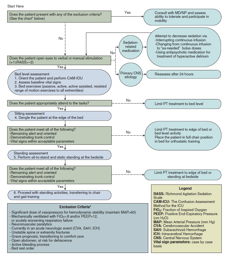 다음 단계에서는 가능한 한 많은 환자를 early mobilization에 포함하고 불필요하게 제외하는 것을 피하는 것을 목표로 inclusion criteria와 exclusion criteria를 명시적으로 정의하면서 protocol을 만들어야 한다. 물론 의료진은 각 환자의 기본적인 특성과 현재의 임상 상태 및 임상적인 추이를 사전에 정한 기준의 맥락에서 함께 고려함으로써 시행 여부를 결정해야 할 것이다. 다음 figure 45-1은 중환자에서 시행하는 물리치료의 알고리듬의 한 예시를 보여준다.