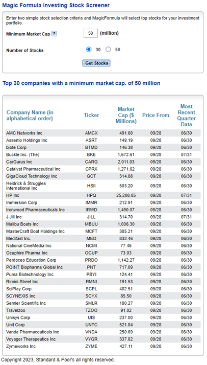 지시에 따라 마법공식에 의해 최상위 등수가 매겨진 기업들의 리스트를 얻는다.