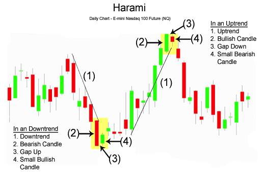 짧은 양봉(또는 십자형)이 전일의 긴 음봉에 의해 감싸인 패턴이다. 주가의 하락 추세가 진행된 이후 이 패턴이 나타나면 일반적으로 상승 추세로 반전될 가능성이 높다. 그러나 이 패턴이 출현한 이후 주가가 상승 반전되지 않는다면 기존의 약세 추세가 더욱 강화되어 나타날 가능성이 크다. 일반적으로 Harami보다 강한 반전 신호로 빈번하게 나타난다.