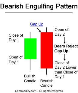 상승 추세에서 형성되는 패턴. 전일 양의 몸통을 다음날 긴 음의 몸통이 감싸 안는 형태로 이전까지의 상승 추세를 하락으로 반전시킬 가능성이 매우 높은 패턴이다. 첫 번째 봉의 크기가 작고 두 번째 봉의 크기가 클수록, 거래 범위가 두 번째 봉에 의해 완전히 감싸일수록 신뢰도는 증가한다. 만일 두 번째 봉에 대량거래가 수반되었다면 더욱 의미가 있다. 비교적 빈번하게 발생하며 신뢰도가 높은 패턴이다.