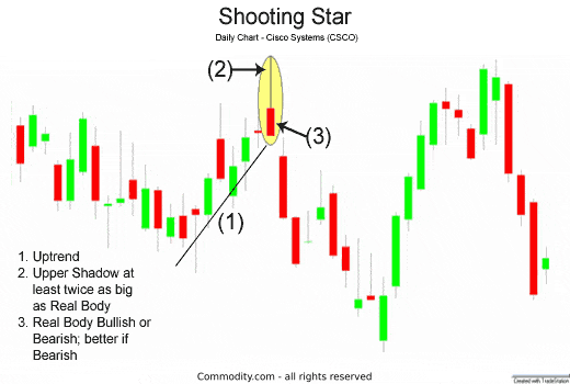 주가 상승 국면 중에 최고점에서 나타난다. 시가가 갭을 이루며 상승 출발하였다가 긴 위 그림자를 형성하며 추가 상승에 실패하며 되밀려서 시가 부근에서 종가가 형성되며 짧은 몸통을 형성하는 패턴이다. 역전된 망치형(inverted hammer)과 동일한 패턴으로 종가가 저가 부근이나 동일하게 형성되는 형태이다. 일반적으로 이 패턴 이후에는 추세가 하락 반전될 가능성이 매우 높다. 몸통의 색깔은 중요하지 않지만 직전 붕괴의 갭 여부는 매우 중요하다. 물론 현실적으로는 갭 없이 나타나는 유성형이 많지만 진정한 의미의 유성형은 직전 붕괴의 갭이 필수적이다. 또한 유성형은 2 ~ 3 개의 봉을 합성하였을 때 명확하게 나타나는 경우도 있고 이때 신뢰도가 더욱 높아지기 때문에 전후의 봉을 합성하여 살펴볼 필요도 있다.