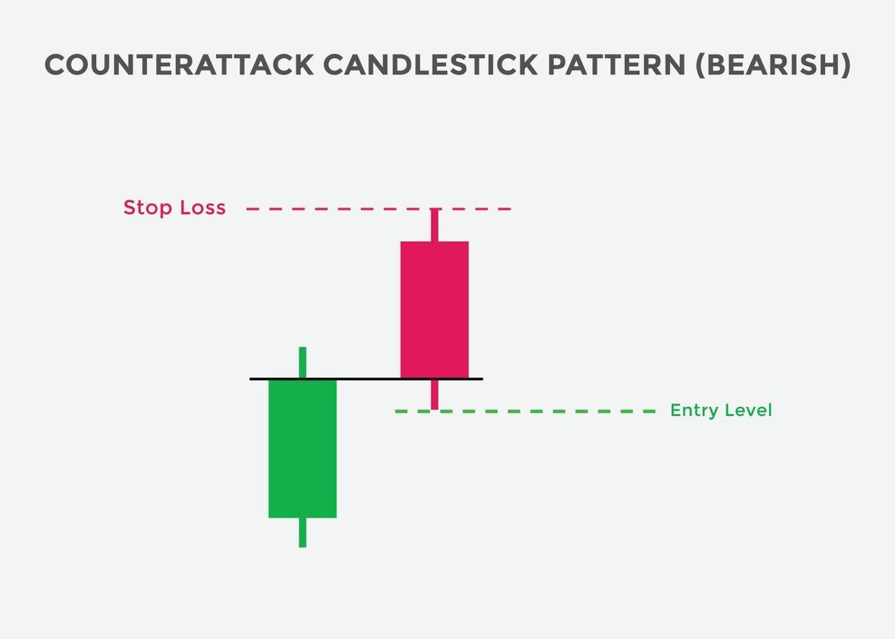 색깔이 다른 두 개의 캔들이 비슷한 종가를 형성하였을 경우 이를 직전의 움직임에 대한 반격이라고 표현한다. 하락 반격형은 우선 긴 양봉과 긴 음봉으로 구성되고 두 봉의 종가가 같거나 비슷한 경우이다. 뒤 음봉이 첫 번째 양봉의 몸통 위로 올라가면 형성하게 되는 먹구름형보다는 반전의 의미가 작지만 나름대로 상당한 신뢰도를 갖는다. 중요한 점은 두 번째 음봉의 시가가 매우 높게 형성되어야 한다는 것이다. 즉 기존 추세를 강하게 이어가다가 크게 반전해야 되기 때문이다.