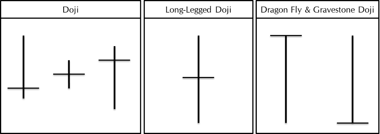 Dogi(도지)란 몸통이 너무 작아서 시가와 종가가 같아지는 형태이다. 시장에서 매수와 매도의 힘이 중립을 이루는 경우에 나타난다. 이 패턴은 이후의 추세 흐름에 중요한 변화가 일어날 수 있는 신호가 될 수 있으므로 다른 캔들과 동시에 해석해야 한다. 일반적으로 완전히 시가와 종가가 일치하는 형태는 드물며 시가와 종가가 약간의 차이를 보여도 Dogi에 포함시킬 수 있다.