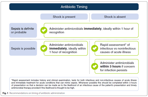 12. 패혈성 쇼크 가능성이 있거나 패혈증일 가능성이 높은 성인 환자의 경우, 상황을 인지한 지 1 시간 이내에 항생제를 투여할 것을 권고한다.