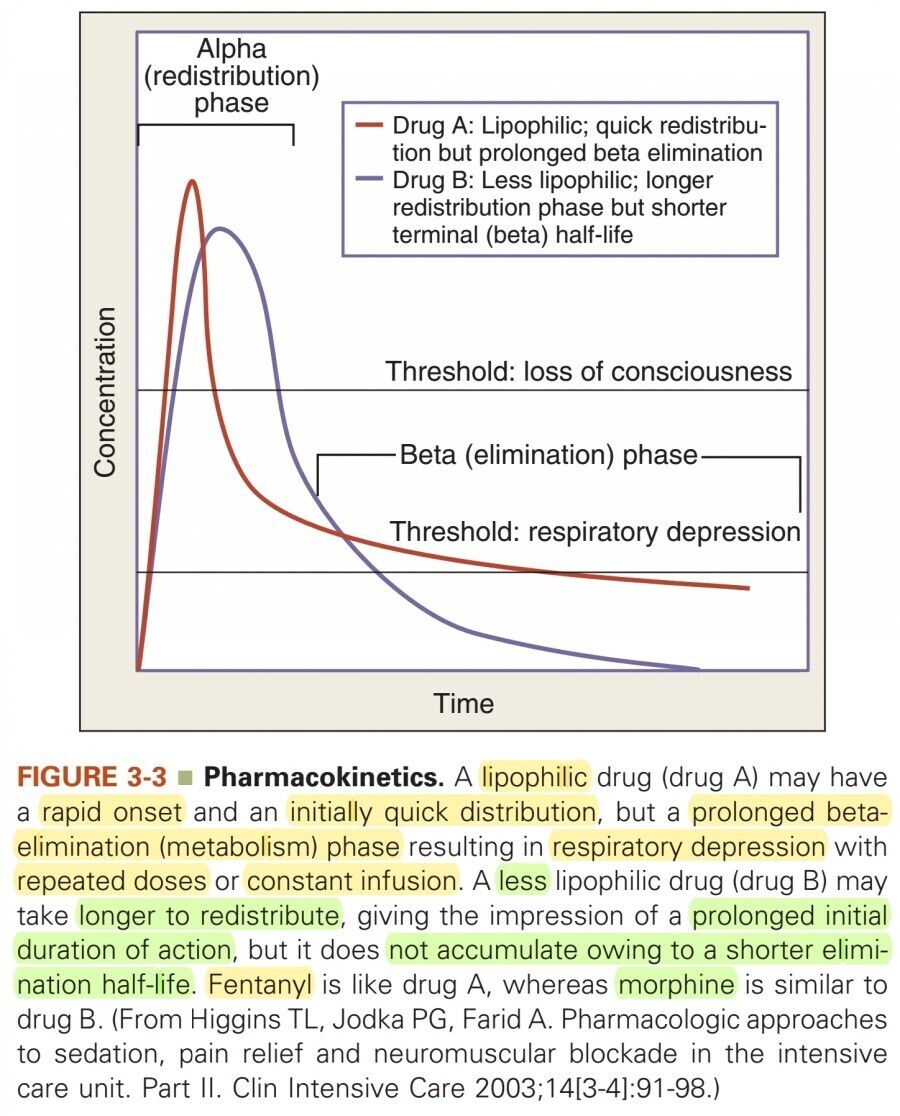 Opioids는 중환자에게 투여하는 가장 흔한 약물 중 하나이며, scheduled, intermittent infusion 혹은 continuous infusion으로 titration을 해야한다. 이 용법은 intramuscular, enteral, transdermal administration 시 발생할 수 있는 unpredictable bioabailability를 피할 수 있으며, 좀 더 안정적인 한 혈중 농도를 유지할 수 있다. 하지만 이러한 용법으로 analgesics를 투여하는 것의 장점은, excessive sedation, respiratory depression, prolonged intubation의 위험성과 균형을 맞춰야 한다. Sedative durg와 alalgesic drug infusion을 scheduled daily interruptions 함으로써 위 문제점들을 피할 수 있는데 이를 “sedation vacations” 혹은 “sedation holidays”라고 한다. 이 방법은 기계 호흡의 기간과 ICU 재실 기간을 줄여준다고 알려져 있다. Short acting drugs로 알려진, 예를 들어 fentanyl과 같은 약물들은 심각한 신기능 장애나 간장애가 없는 환자에서도, fat accumulation으로 인해서 infusion 시 작용 기간이 확연하게 늘어날 수 있으므로 주의가 필요하다.