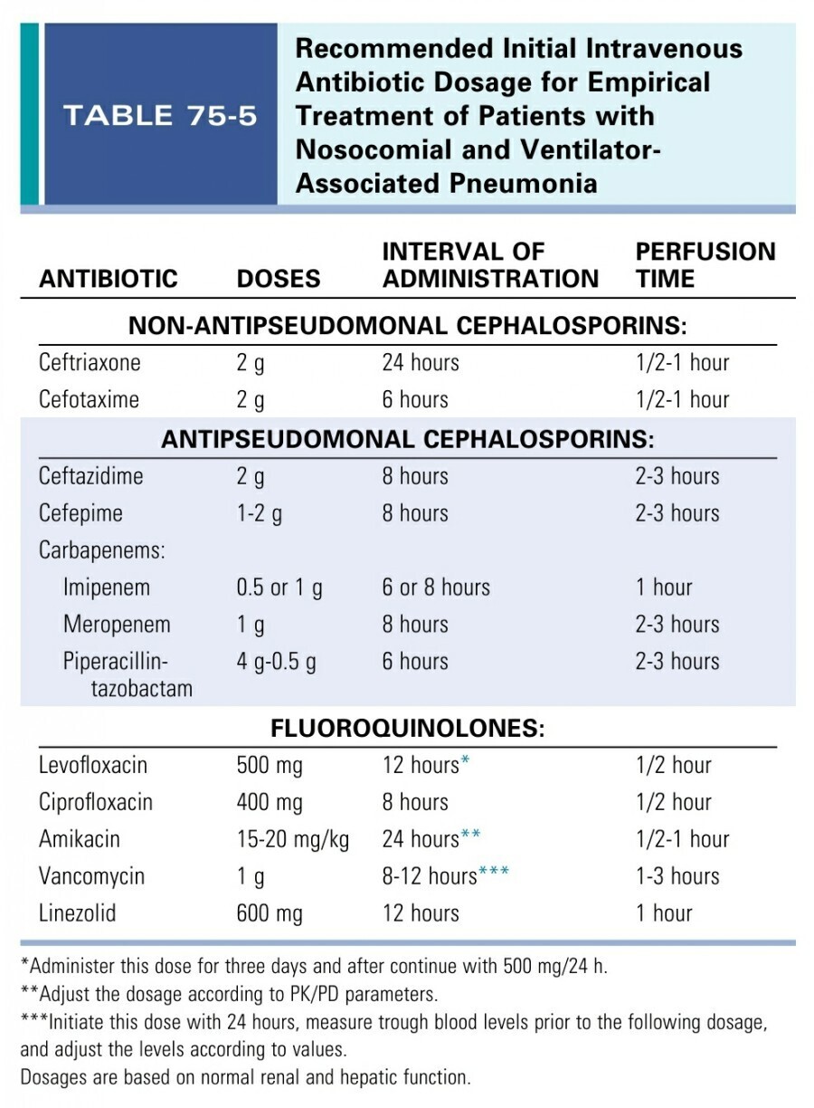최근의 ATS/IDSA guideline에서 권고하는 항생제는 table 75.3과 table 75.4에 있습니다. Table 75.5는 경험적 항생제의 적절한 용량을 보여줍니다. 광범위 경험적 항생제는 내성균의 발생을 줄이기 위해서 배양 검사 결과가 나오자마자 빠르게 de-escaltion 해야 합니다.