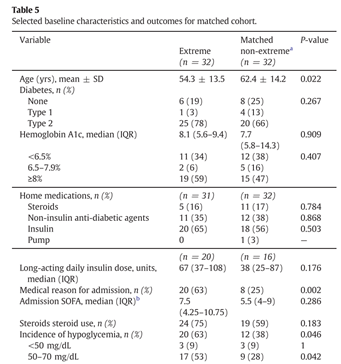 Extreme 군이 32명, non-extreme 군이 96명이었으며, 목표 혈당은 100 - 150 mg/dL였다. Extreme 군에서 기저 질환으로 type 2 당뇨병이 있는 경우가 더 많았고, hemoglobin A1c 중윗값이 더 높았으며, 입원 전 insulin 치료 중이었던 경우, 내과적 원인으로 입원한 경우, 입원 중 스테로이드 치료를 받은 경우가 더 많았다. Extreme 군에서 저혈당 발생이 더 많았고(<70 mg/dL, 63% v. 34%, p = 0.005), 혈당 조절이 되는데 걸리는 시간이 더 길었으며(19.8 h v. 5.7 h, p < 0.001), 사망률 또한 더 높았다(34% v. 15%, p = 0.014).