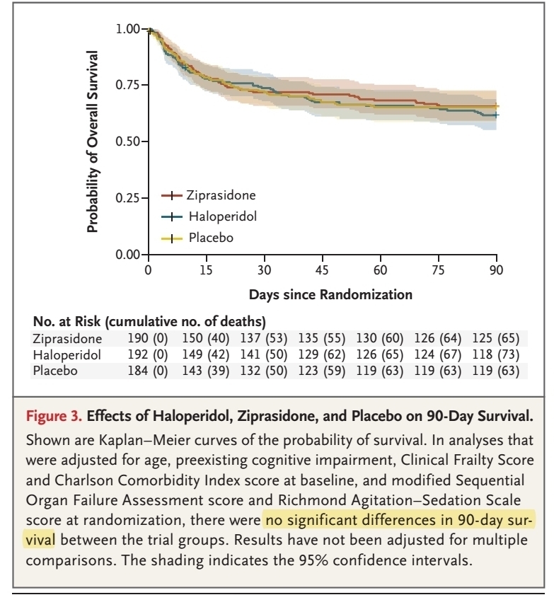 1183명의 환자를 대상으로 하였으며, 이중 566명 (48%)의 환자에서 delirium이 발생하였는데 89%는 hyperactive, 11%는 hypoactive delirium이었다. 이 566명의 환자를 무작위로 할당해서 184명은 placebo, 192명은 haloperidol, 190명은 ziprasidone을 투여하였다. Placebo나 각 약물을 투여받은 median duration은 4일 (interquartile range, 3 to 7)이었고, delirium이나 coma가 없이 생존한 날의 median number는 8.5 (95% confidence interval [CI], 5.6 to 9.9) in the placebo group, 7.9 (95% CI, 4.4 to 9.6) in the haloperidol group, and 8.7 (95% CI, 5.9 to 10.0) in the ziprasidone group (P = 0.26 for overall effect across trial groups)였습니다. Placebo와 비교해서 haloperidol과 ziprasodone의 primary end point는 유의한 차이가 없었다(odds ratios, 0.88 [95% CI, 0.64 to 1.21] and 1.04 [95% CI, 0.73 to 1.48], respectively).