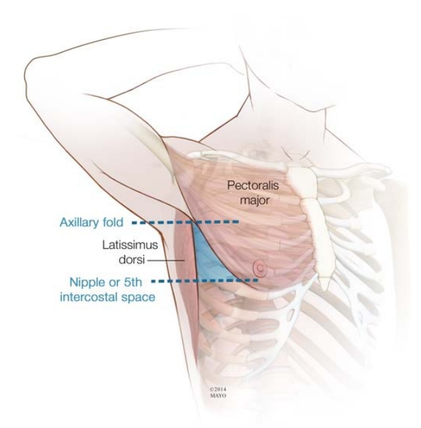 Chest tube insertion 시 chest tube의 적절한 위치는 ‘‘triangle of safety’’ 안에 거치시켜야 한다고 알려져 있다.