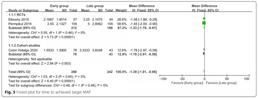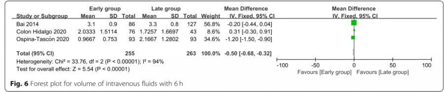 929명을 대상으로 하는 5개의 연구가 포함되었습니다. Meta-analysis 결과 early group의 short-term mortality는 late group에 비해 유의하게 낮았습니다(odds ratio [OR] = 0.45; 95% CI, 0.34 to 0.61; P < 0.00001; χ2 = 3.74; I2 = 0%). Early group에서 목표 평균 동맥압에 도달하는 시간이 더 짧았으며(mean difference = − 1.39; 95% CI, − 1.81 to − 0.96; P < 0.00001; χ2 = 1.03; I2 = 0%), 초기 6시간 동안 주입된 수액량이 더 적었습니다(≥ 65 mmHg).