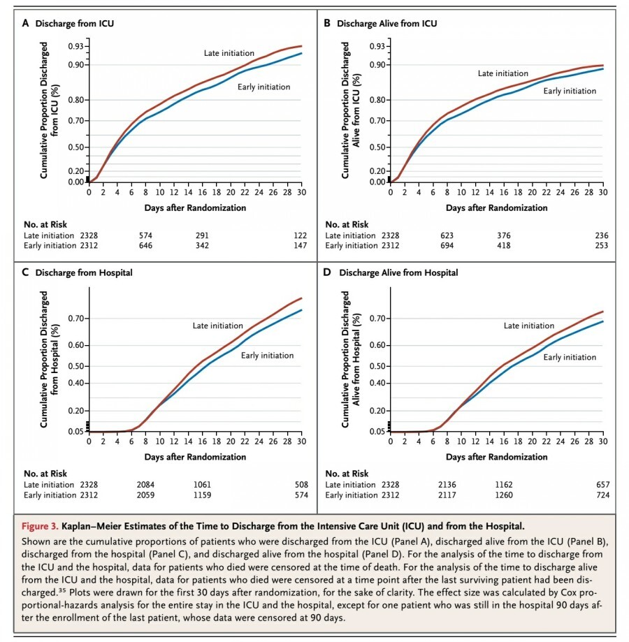 Late-initiation group에서 2일 이상의 mechanical ventilation이 필요한 환자의 비율이 9.7% relative reduction이 있는 것으로 나타났으며(P = 0.006), renal replacement therapy 기간은 3일의 median reduction을 보였고(P = 0.008), health care costs는 €1,110의 median reduction을 보였다(about $1,600) (P = 0.04).