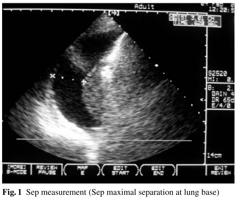 Mean Sep은 35 ± 13 mm, mean V은 658 ± 320 ml였으며, Sep과 V 간의 significant positive correlation는 r = 0.72; r2 = 0.52; p < 0.001였습니다. Pleural fluid volume의 양의 추정치는 다음과 같은 공식을 이용했습니다: