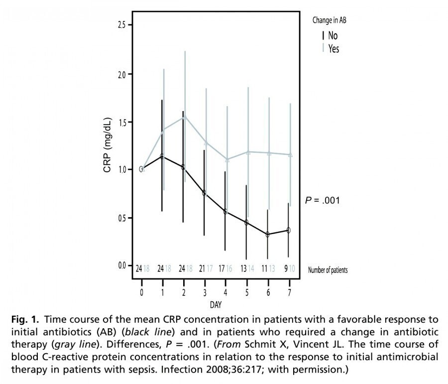 Sepsis에 빠진 중환자군에서 적절한 항생제 치료를 사용했을 때 serum CRP level은 감소하지만, 현저한 variability로 인해 항생제 치료를 중단에 대한 최저 plasma concentration을 정하기는 어렵습니다.