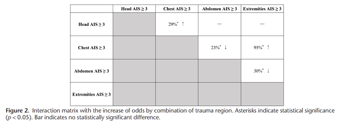 2004년에서 2017년 사이에 Japan Trauma Data Bank에 등록된 외상 환자에 대해서 후향적 연구를 진행하였습니다. 손상은 네 부위(head, chest, abdomen, extremities)에 따라 분류하였습니다. 공변량을 두 부위의 조합에 의한 상호작용을 공변량으로 해서 다변량 로지스틱 회귀분석을 시행하였습니다.