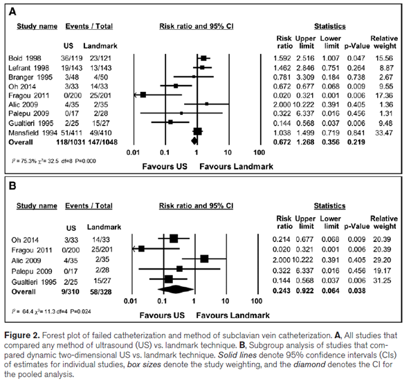 Ultrasound-guided subcavian vein catheterization(초음파 유도하 쇄골하 정맥 카테터 삽입술)에 대해 많은 보고들이 있지만 이에 대한 명확한 증거는 아직 없습니다. 따라서 본 연구에서는 "blind" landmark method와 비교해서 ultrasound-guided subclavian catheterization을 시행하였을 때 실패하는 경우와 부작용에 대해서 systematic review and meta-analysis(체계적 고찰 및 메타분석)를 시행하였습니다. 시행한 초음파 검사는 dynamic 2D ultrasound와 static 2D ultrasound, Doppler를 모두 포함하였습니다.