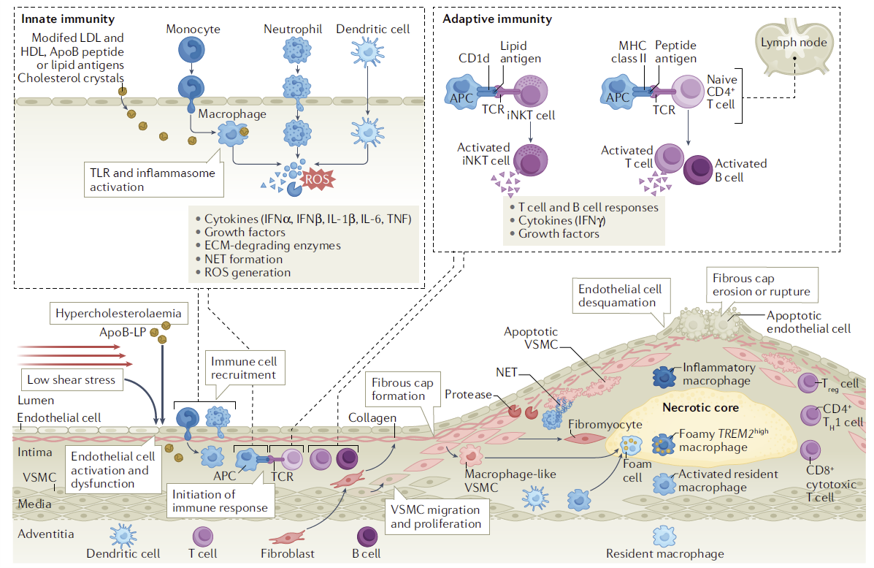Monocyte differentiation, local proliferation, vascular smooth muscle cells(VSMCs)에서의 transdifferentiation등에 의해 생성된 macrophage는 plaque에 presentation 된 lipoprotein을 흡수하고 plaque necrotic core형성을 위한 토대를 마련하는 lipid-laden foam이 됩니다. Immune synapse에서 macrophage, dendritic cell, B cell 등 antigen-presenting cell(APC)는 lipid antigen을 invariant natural killer T cell(iNKT)에게 presentation하고, peptide antigen을 T cell에 presentation 하는데, 후자는 T cell과 B cell의 adaptive response에 관여합니다. Antigen presentation은 plaque나 lymph node와 같은 secondary lymph organ에서 나타납니다. 이러한 모든 과정들은 endothelial dysfunction에 기여하여 지속적인 monocyte recruitment, plaque lipid burden에 추가되는 lipoportein의 uptake 증가, VSMC 활성화 및 증식, fibroblast migration을 통해 inflammation을 더욱 악화시키고 fibrous cap 형성으로 이어지게 됩니다.