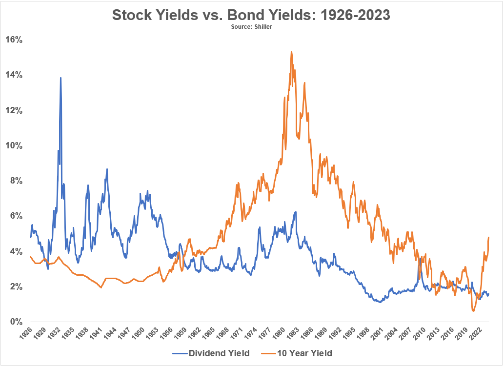 20세기 초반에는 실제로 수십 년 동안 주식이 국채보다 훨씬 더 많은 수익을 올렸습니다. 이는 부분적으로 대공황의 붕괴로 인한 것이었습니다. 또한 당시에는 주식 투자자가 적었기 때문에 기업이 주식 투자자를 유치하기 위해 풍부한 배당수익률을 제공해야 했다는 사실과도 관련이 있었습니다. 하지만 이러한 관계는 1950년대 강세장과 1960년대에 시작된 인플레이션 기간 동안 역전되었습니다. 주식은 2009년 초 금융 위기가 발생한 이후 짧은 기간을 제외하고, 국채보다 더 많은 수익률을 올리지 못했고, 그 이후로는 서로 앞서거니 뒤서거니 했습니다.