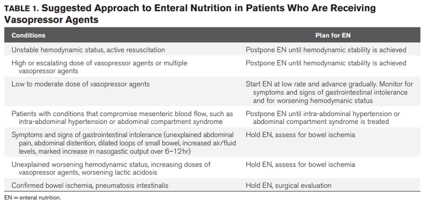 Vasopressor(승압제)를 증량하거나 gastric ileus의 증상이 있는 경우가 아니라면, sepsis(패혈증)나 shock 환자에서도 EN을 안전하게 시행할 수 있다.