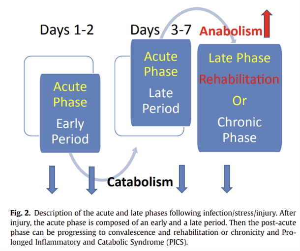 - Acute phase 동안 hypercatabolism이 우세하고 이는 energy deficits를 초래한다.