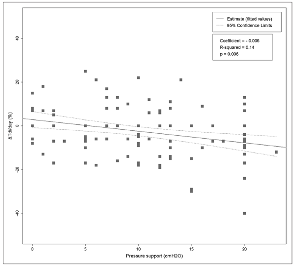 다변량 분석 결과 오직 ventilator suppot 정도가 diaphragmatic atrophy rate을 예측하는 인자였다. Pressure support predicted diaphragm thickness의 coefficient는 –0.006 (95% CI, –0.010 to –0.002; p = 0.006)였습니다.