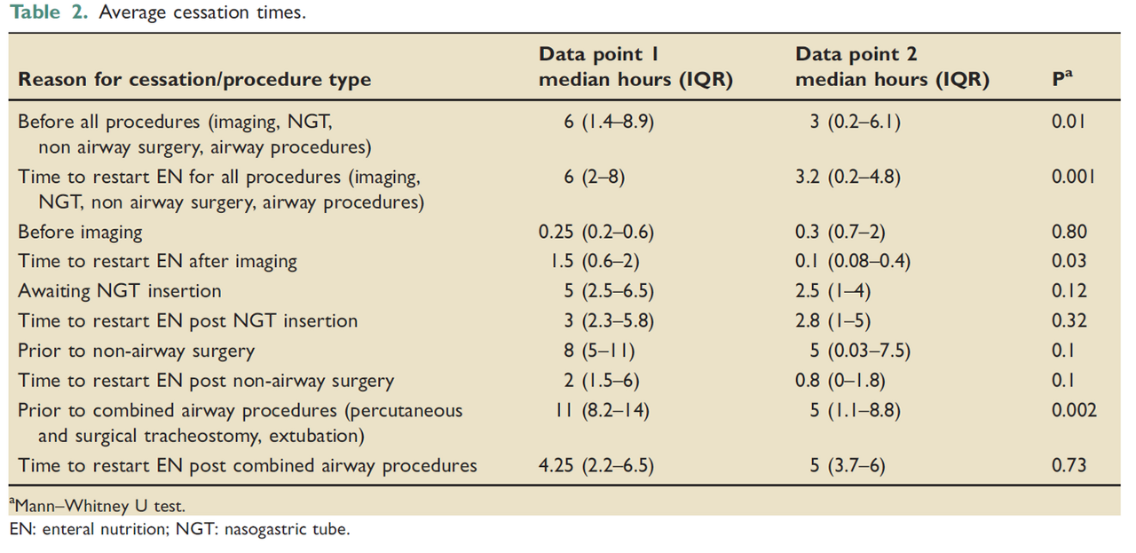 첫 데이터 수집 기간에서는 62건, 두 번째 데이터 수집 기간에서는 64 건의 enteral nutrition 중단을 확인할 수 있었다. Surgery와 airway procedure가 금식 기간 증가의 가장 주요한 두 가지 요인이었다. Fasting guideline을 시행으로 airway procedure와 관련된 금식 시간이 통계적, 임상적으로 유의미하게 감소하였다(non-airway procedure에서는 그렇지 않았음). Calorie deficit 역시 가이드라인 적용 후 통계적, 임상적으로 유의미하게 감소하였다.