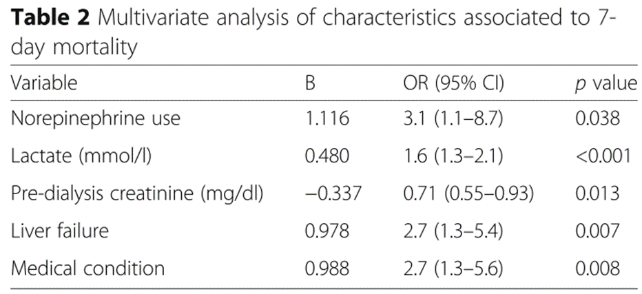 Multivariate adjustment 후 다음 5가지의 variable이 primary outcome(early mortality)와 관련 있는 것을 확인할 수 있었다: norepinephrine utilization, liver falire, medical condition, lactate level, pre-dialysis creatinine level