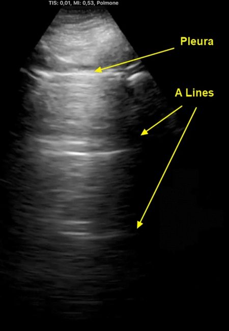 Horizontal arfifact(수평 허상)으로 알려지기도 한 A-line은 갈비뼈 음영들 사이에서 pleural line이 반복되는 모양으로 나타난다. A-line의 존재는 정상으로 간주되며, B-line이나 lung rockets(폐 로켓)이 모일 때는 관찰할 수 없다.
