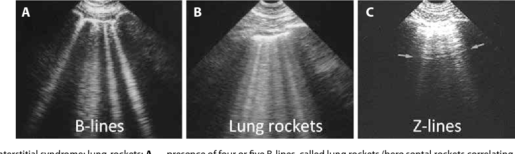 B-line은 pleural line에서 시작하여 희미해짐 없이 화면의 끝까지 확산되는 명확히 확인되는 형태의 artifact이다. B-line으로 인해 A-line이 화면에서 보이지 않고, lung sliding과 함께 움직인다. 단일의 B-line 또는 lung dependent portion(폐 의존 부위)에서 여러 개의 B-line이 정상인에서도 관찰될 수 있다. 하지만, 폐의 앞/윗부분에서 관찰되는 여러 개의 B-line은 보통 'lung rocket'이라고 불리며, 이는 병리적인 변화이다.