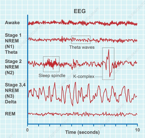 인간의 수면은 non-rapid eye movement (NREM, 비급속 안구 운동) 수면으로 구성되어 있으며 가벼운 NREM(stage 1, 2, N1, N2)와 깊은 수면(stage 3, N3)이 있다. 각성과 NREM 수면의 구별은 EEG(electroencephalogram, 뇌파검사)의 30초 부분을 시각적으로 분석함으로써 가능하다: