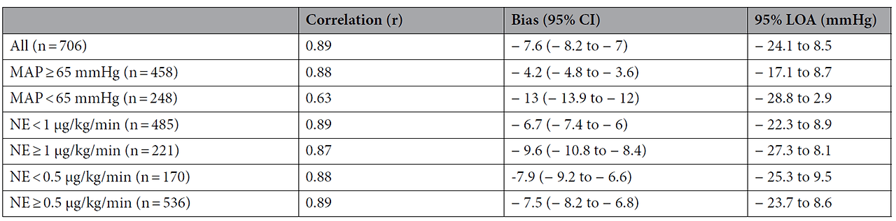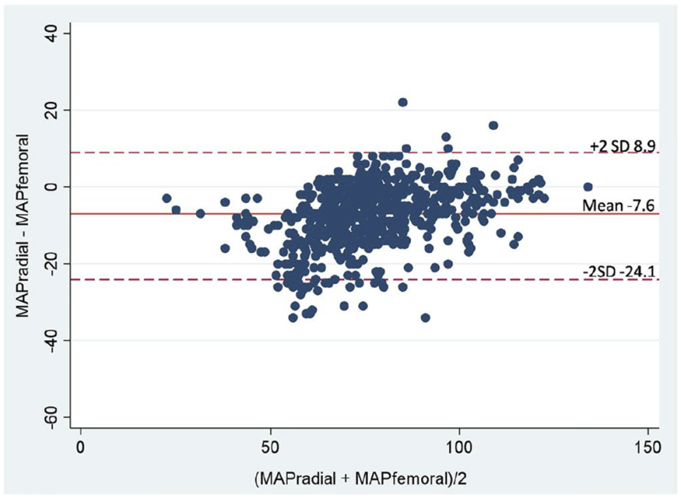 Medical intensive care unit(내과계 중환자실)에서 후향적(prospective)으로 연구를 진행하였다. 24시간 동안 환자의 MAP_radial artery와 MAP_femoral artery를 매 시간 측정하였는데, 32명의 환자에서 총 706건의 paired data points를 얻을 수 있었다. MAP_radial은 MAP_femoral과 강한 상관관계가 있었지만(strongly correlated, r = 0.89, p < 0.0001), 전체적으로 MAP_femoral에 비해 7.6 mmHg 정도 유의미하게 낮았다. MAP_radial과 MAP_femoral 간의 bias는 -7.6 mmHg (95% limits of agreement (LOA), − 24.1 to 8.9)이었다.
