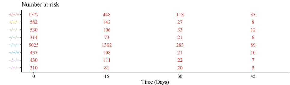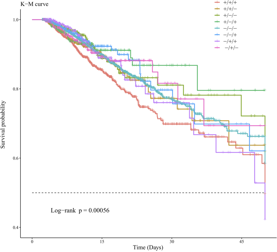 첫 3일 동안의 fluid balance에 대한 연구에서는 9,205명의 환자가 포함되었으며, Kaplan-Meier curve로 8 group의 survival difference를 확인하였다. Cox model로 "+/+/+" group과 비교한 결과, “+/ −/−”, “−/ −/−”, “−/ −/+”, “−/+/+”, “−/+/−” group의 in-hospital mortality 위험이 더 낮았다: 각각 HRs of 0.65 (0.45,0.93), 0.72 (0.60,0.86), 0.63 (0.43,0.93), 0.69 (0.48,0.98), 0.63 (0.42,0.96)