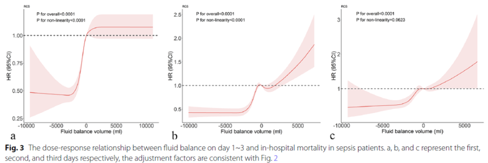19,557명의 환자가 연구에 포함되었으며, sepsis 진단 후 day 1, 2, 3에서 positive fluid balance를 보인 환자들은 poor prognosis와 관련이 있었다: 각각 HRs of 1.29 (1.20,1.40), 1.13 (1.01,1.27), 1.25 (1.08,1.44) 반면, day 4, 5의 경우 fluid balance와 prognosis 간에는 이러한 연관성을 찾을 수 없었다.