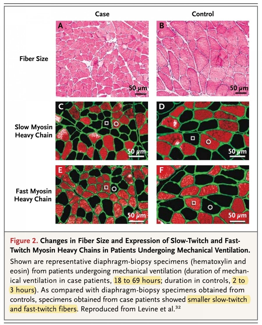 Levine 등은 인간에서 complete diaphragmatic inactivity 후 적어도 18시간 안에 diaphragm myofibers의 atrophy가 나타났다고 보고하였다(figure 2).