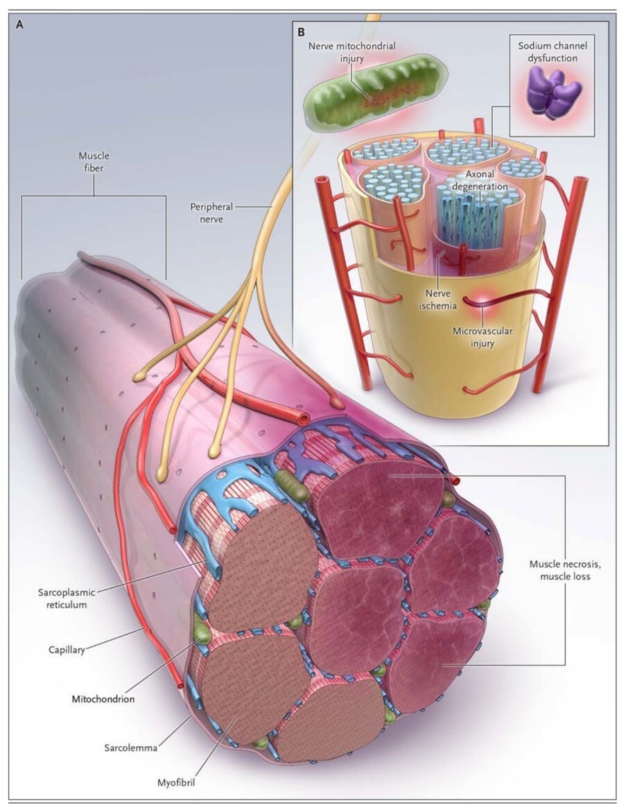 중환자들의 여러 문제들에 영향을 받는 것 중 하나가 peripheral nervous system이다. Skeletal-muscle wasting과 관련된 catabolic state는 중환자에서 흔하며 또한 매우 빠르게 나타나는데, 특히 sepsis에서 그렇다. Critical illness로 생존한 환자들과 비교해서 사망한 환자에서 skeletal muscle의 mitochondrial dysfunciton이 더 크게 나타났다. Systemic inflammation과 oxidative stress가 감소된 muscle strengh와 연관이 있다.