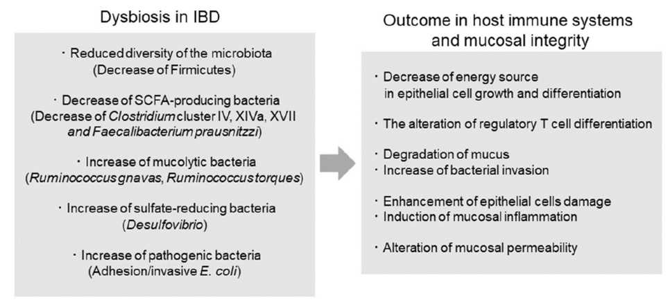 Gut microbiota 파괴에 영향을 받은 대사 산물의 생성은 IBD의 발병 기전과 관련이 있다. 그 예로, F. prausnizzi 및 Clostridium clusters IV, XIVa, XVIII와 같은 butyrate-producing bacteria에 의해 IBD 환자에서 SCFAs(short chain fatty acids) 농도가 감소한다. SCFAs 감소는 장의 항상성을 유지하는데 중요한 역할을 하는 epitheilal cell의 성장과 Treg cell의 differentiation과 expansion에 영향을 미친다. 반면 Desulfovibrio와 같은 sulfate-reducing bacteria는 IBD 환자에서 더 많아서, 다량의 hydrogen-sulfate로 인해 intestinal epithelial cell이 손상되고 점막 염증이 발생하게 된다.