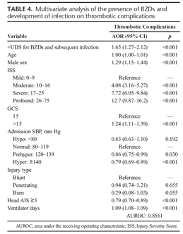 Benzodiazepine(BZD, 벤조디아제핀)은 macrophage의 peripheral γ-amino-butyric acid type A에 영향을 줌으로써 면역 반응을 조절한다. Macrophage는 감염을 증가시키는 proinflammatory cytokines의 작용을 억제한다. 이전 여러 연구들에서 감염은 혈전 합병증(thrombotic complications) 발생을 증가시킨다고 보고된 바 있다. 본 연구는 이러한 상관관계가 외상 환자에서도 나타나는지 알아보았다. 본 연구에서는 외상 환자가 입원 당시에 나간 urine drug screen(USD)에서 BZD 양성 시 감염 합병증과 혈전 합병증 모두가 증가한다고 가정하였다.