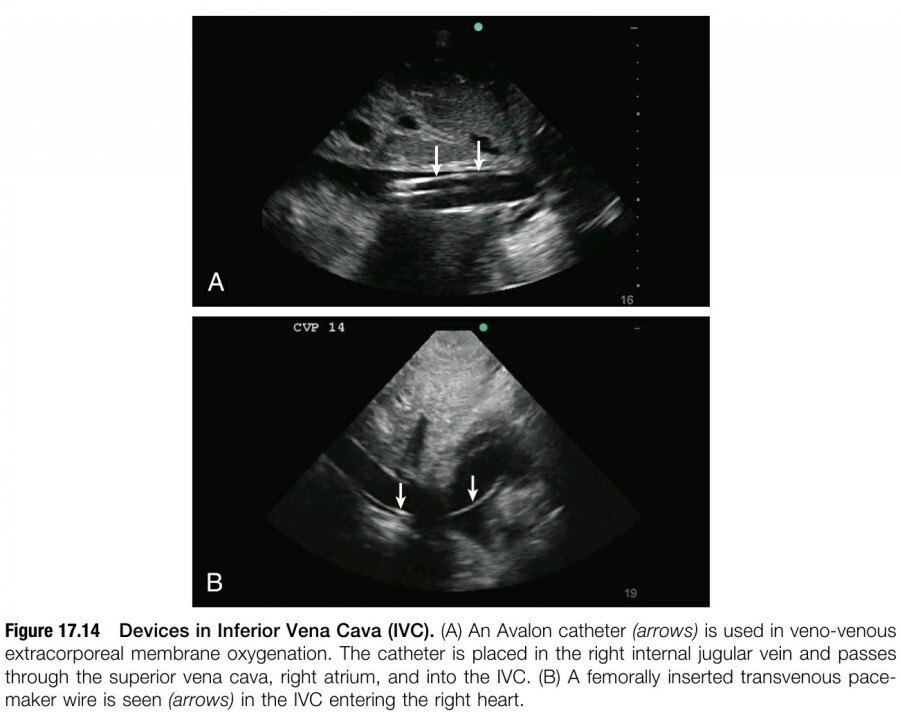 증환자에서 여러 device들이 IVC를 통해 삽입된다(eg, femorally inserted temporary pacemakers, bicaval veno-venous catheters for extracorporeal membrane oxygenation [ECMO], IVC filters, etc.). IVC ultrasound를 이용해서 precedure 동안에 placement가 잘 이루어졌는지, inadvertent dislodgement나 procedure 후 migration이 일어나지 않았는지 확인할 수 있다(figure 17.14).
