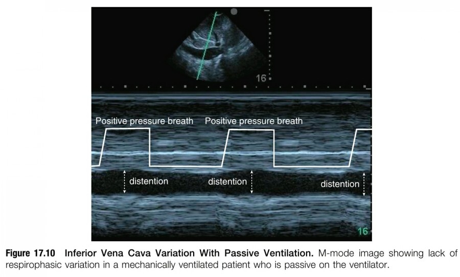 수동적으로 mechanical ventilation 중인 환자들(ie, not triggering any breaths)은 fluide resposiveness를 판단 다는 데 있어 ultrasound로 IVC를 측정하는데 가장 적합한 환자군으로 알려졌다(figure 17.10). 오래전에 발표된 소규모 연구들에서 fluid responsiveness와 12%~18% 이상의 IVC distensibility index(IVCmax diameter − IVCmin diameter / IVCmax diameter) 사이에는 상관관계가 있다고 보고하였다. 이 환자군은 ventilating tidal volume이 8 ml/kg 이상이고 regular cardiac rhythm을 보여야 한다는 strict enrollment criteria를 가진다. 최근의 몇몇 연구에서는 IVC distensibility index가 fluid responsiveness를 평가하는 데 있어서 reliability가 떨어진다고 하였고, 수술 환자가 39%에서 위의 criteria를 만족시키는 데 반해서, 중환자는 매우 적었다(2%)고 보고하였다. 어찌 되었든 IVC distensibility는 임상적으로 아직은 specific 한 concept로 남아 있다.