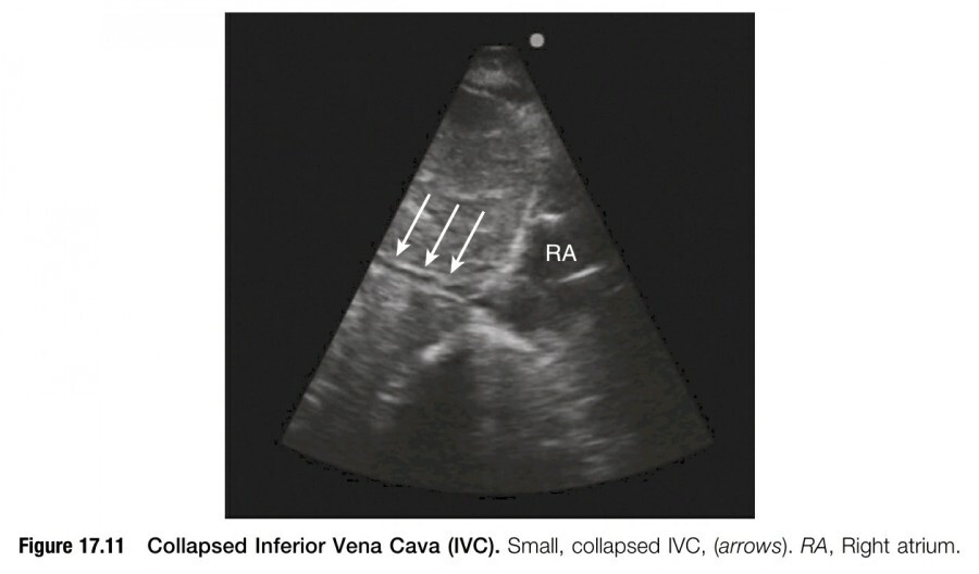 IVC diameter가 1cm 미만으로 작거나 호흡하는 동안 완전하게 collapse 되어 있다면