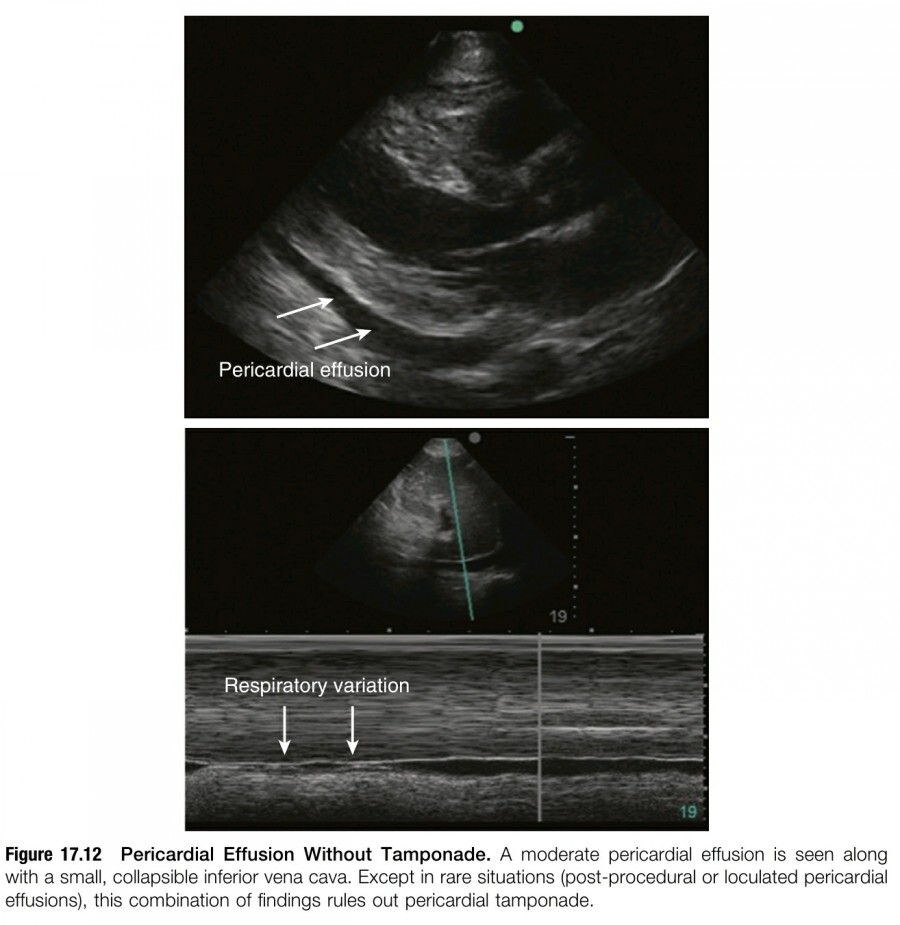 Pericardial effusion이 확인되고 cardiac tamponade가 의심된다면, IVC ultrasound는 pericardiac sac 안의 pressure가 right atrial pressure와 CVP를 상회하는지 여부를 확인할 수 있는 sensitive screening tool이다. Pericardial effusion이 있고 plethoric IVC(deep inspiration 후 50% 미만의 collapse가 있을 때)를 보이는 경우 tamponade 진단에서 sensitivity는 97%이지만, specificity는 단 40%이다. 따라서 tamponade가 의심되는 경우, deep inspiration 시 IVC collapse가 50% 이상이라면 더 이상의 추가적인 echocardiographic technique 없이도 tamponade를 효과적으로 rule out 할 수 있다(figure 17.12).