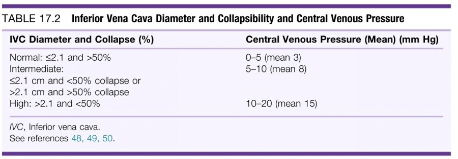 IVC diameter와 collapsibility는 오랫동안 cardiologist들에게 CVP를 측정하는 데 사용되어 왔는데, CVP 측정은 다른 advanced echocardiac measurement들과 같이 pulmonary arterial pressure를 계산하는데 이용된다. 하지만 volume status와 fluid management를 guide하는 데 있어서 CVP의 유용성은 논란이 많으며 제한점을 가지고 있다. IVC diameter와 collapsibility를 이용해서 CVP를 계산하는 guideline은 table 17.2에 있다. 이 measurements는 의식이 있고 자발 호흡이 가능한 환자들에서 validation 하였고 mechanical ventilation 중인 환자에서는 그렇지 않다는 것을 유념해야 한다.