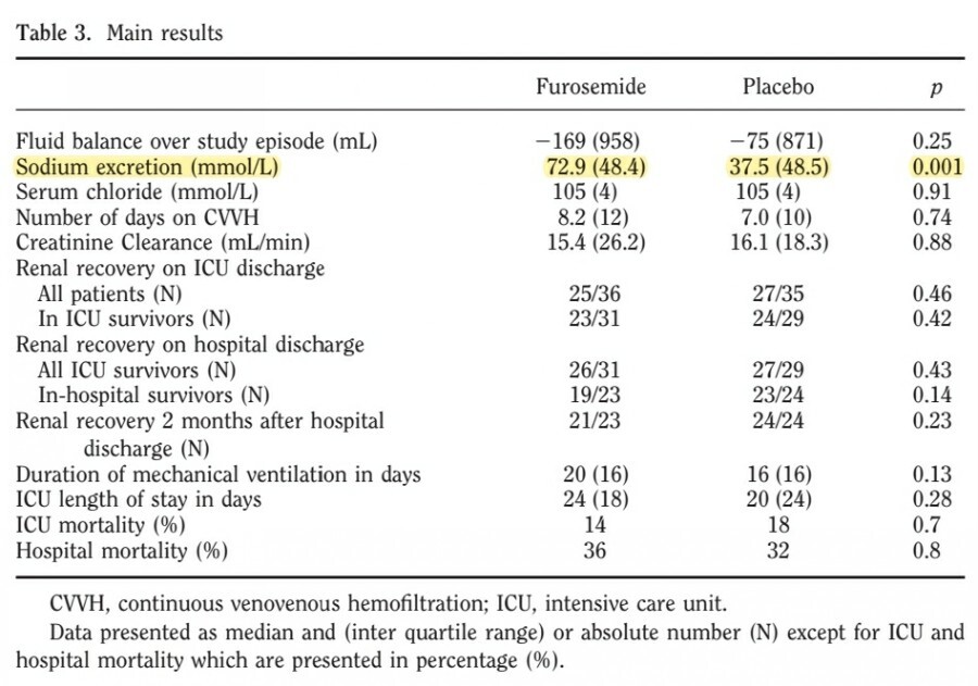 creatinine without renal replacement therapy)가 되는지 여부였다. Furosemide-treated group(71명)에서 urinary volume이 placebo-treated group보다 더 많았고(median 247 mL/hr (interquartile range [IQR] 774 mL/hr) vs. 117 mL/hr (IQR 158 mL/hr), p = 0.003), sodium excretion도 더 많았다(median 73 mmol/L (IQR 48) vs. 37 (IQR 48) mmol/L, p = 0.001). Furosemide group의 25명과 placebo group의 27명이 중환자실 퇴실 시에 renal fuction의 회복을 보였다(p = 0.46). Furesemide group에서 2명의 환자가 long-term dialysis tendency를 보였다(p = 0.23).