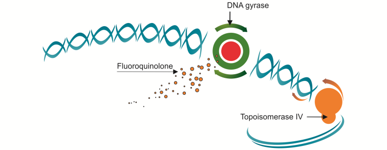 Quinolone(ciprofloxacin, levofloxacin) 은 세균의 DNA synthesis를 억제함으로써 살균 효과를 나타낸다. DNA synthesis를 억제하는 과정이 완전히 밝혀지지는 않았으나 현재까지는 topoisomerase계 효소인 DNA gyrase와 topoisomerase IV를 억제함으로써 세균의 DNA와 결합된 topoisomerase를 끊어 내는 작용 기전을 가진 것으로 알려져 있다.