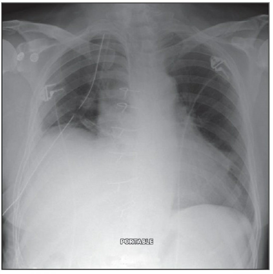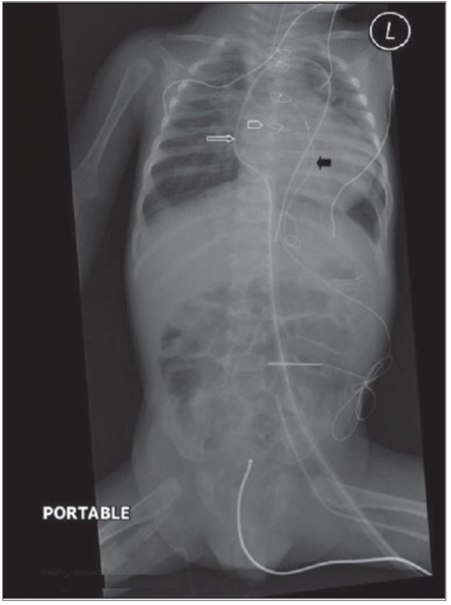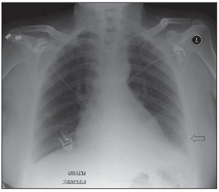 Thoracotomy를 시행받고 나온 환자의 initial postoperative chest X ray에서 각종 line과 endotracheal tube, thoracotomy tube, mediastinal drains, central venous catheter 등을 확인할 수 있을 것이다. 이러한 device들은 그 위치가 제대로 있는지 확인해야 한다.