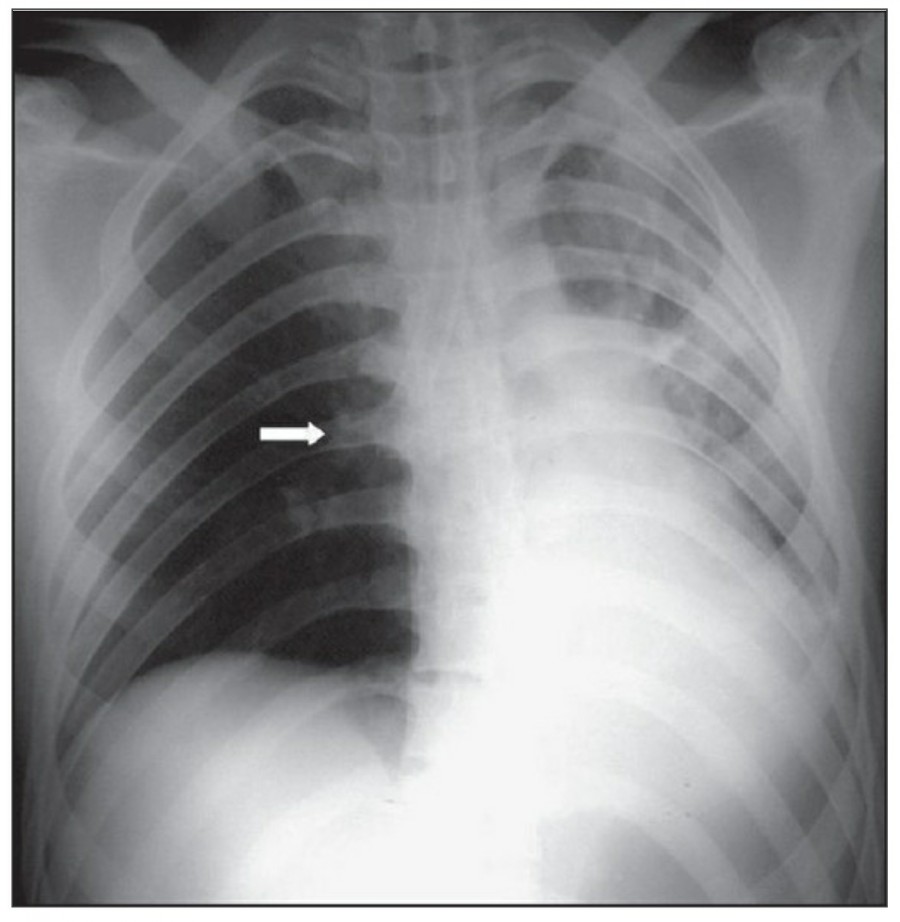 Pleural fissure 안에 위치하는 chest tube는 폐 표면이 늘어날 때 종종 배액이 안될 수 있으므로 적절히 기능을 하기 위해서 thoracic cavity 안에 거치되어야 한다. 마지막 side-hole은 radiopaque line의 interruption으로 확인할 수 있는데, 이 지점은 반드시 thoracic cavity 안에 위치해야 한다. Thoracic cavity 밖에 위치하거나 subcutaneous air가 확인되는 경우에 tube가 잘못 들어가 있음을 시사한다. Empyema에서 tube가 제대로 들어가 있지 않다면 배액이 잘 안 되거나 purulent fluid의 loculation이 발생하게 된다.