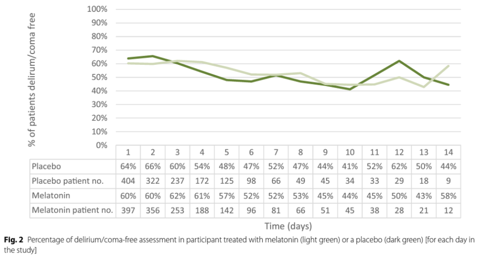 Seondary outcome도 유의미한 차이는 관찰되지 않았다: ICU LOS (median: 5 vs 5 days, p = 0.135), hospital LOS (median: 14 vs 12 days, p = 0816), mortality at any time point including at 90 days (15.5 vs 15.6% p = 0.948), nor in the quantity or quality of sleep. Melatonin으로 인해 보고된 심각한 부작용도 없었다.