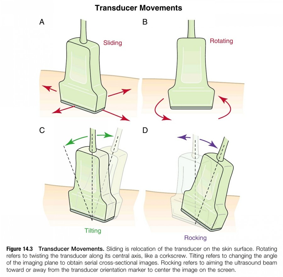 1. Sliding은 skin surface 위애서 transducer를 relocation 하는 것을 말한다; transducer와 skin 사이의 contact point를 물리적으로 이동하는 과정이다.