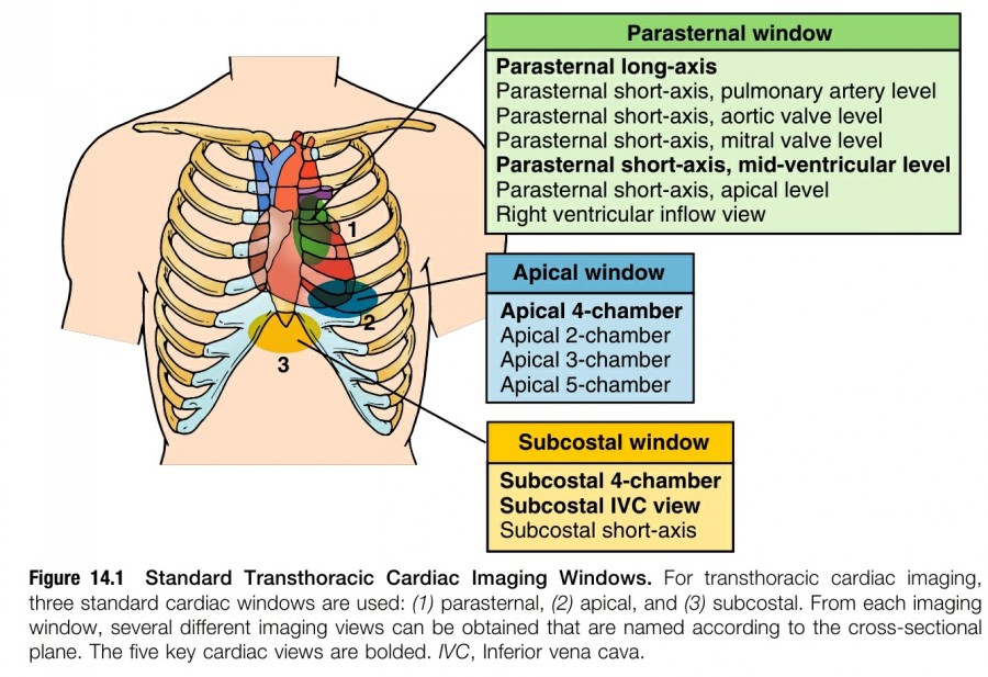 Imaging window란 specific structure를 보기 위해 ultrasound transducer를 위치시키는 body의 anatomic position을 말한다. Transthoracic echocardiography에서는 세 개의 standard imaging window가 있다: parasternal, apical, subcostal windows(figure 14.1).