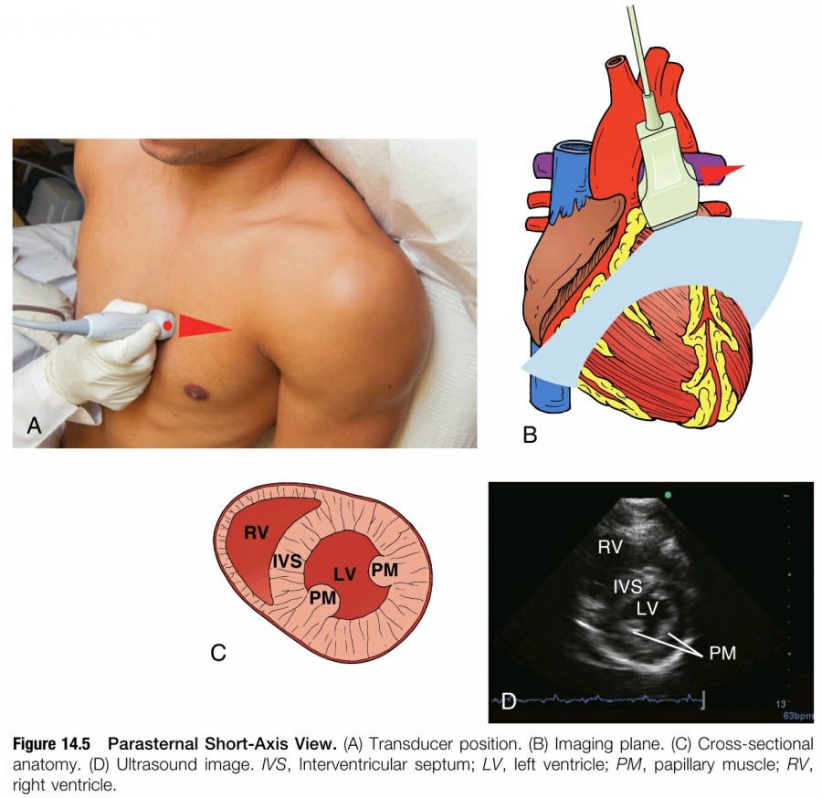 다섯 가지 imaging plane이 Parasternal short-axis view를 얻는 데 이용된다. Point-of-care ultrasound 목적을 고려했을 때, global LV systolic function의 믿을 만한 portroyal을 얻기 위해 midclavicular level이 가장 선호된다. Midclavicular parasternal short-axis view은 cross section에서 양측 papillary muscles이 확인되고 symmetric하게 보일 때 얻을 수 있다. 구형으로 보이는 LV cavity의 cross-sectional image를 얻기 위해서는 transducer를 충분히 rotation 하는 것이 중요한데, oval-shaped LV cavity는 LV function을 잘못 판독할 수 있는 off-axis imaging이나 foreshortening을 보인다.