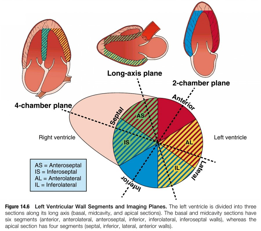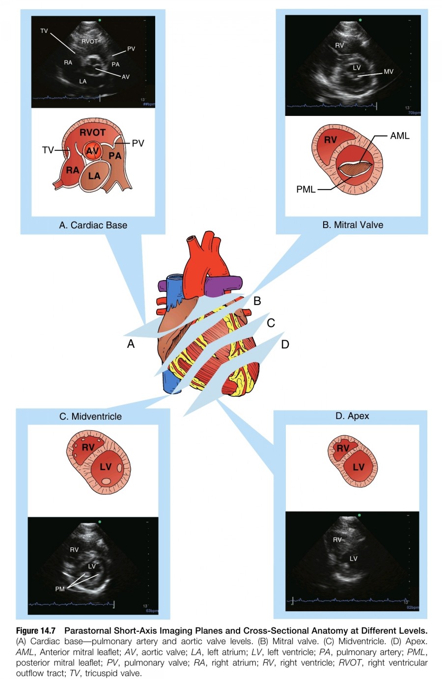 LV systolic function과 segmental LV wall motion을 평가하기 위해서 short-axis midventricular view가 가장 이상적인데, LV wall segments의 nomenclature는 figure 14.6에 있다. 이 view는 RV dilatation과 dysfunction을 평가하는 데 있어 interventricular septum의 shape과 function을 확인하는데 유용하다. Large- 혹은 moderate-sized circumferential pericardial effusion 확인도 가능하다.